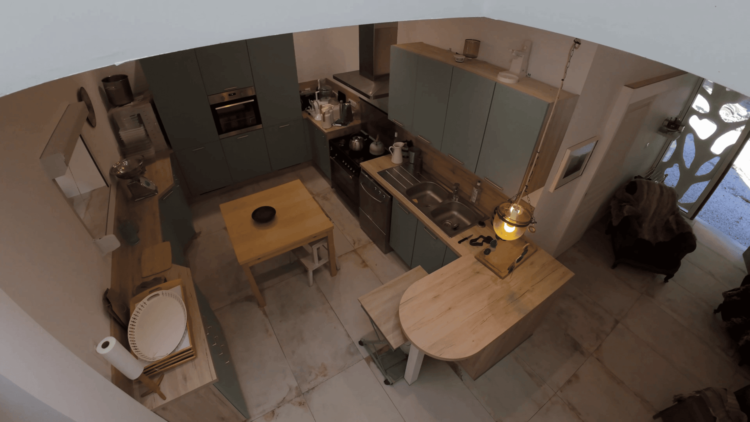 Cuisine semi professionnelle. 2 grands frigo. Un piano et son grand four à gaz. Un four électrique quand le soleil le permet. Un grand passe-plat vers le salon